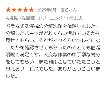 汚れが溜まった洗濯機は洗浄力が低下し、洗剤の使用量が増えたり、すすぎ回数が増えたりすることがあります。分解洗浄をおこなうことで 洗浄力が回復し、時間の短縮や洗剤・水の使用量を減らすことができ、水道光熱費の節約になります。